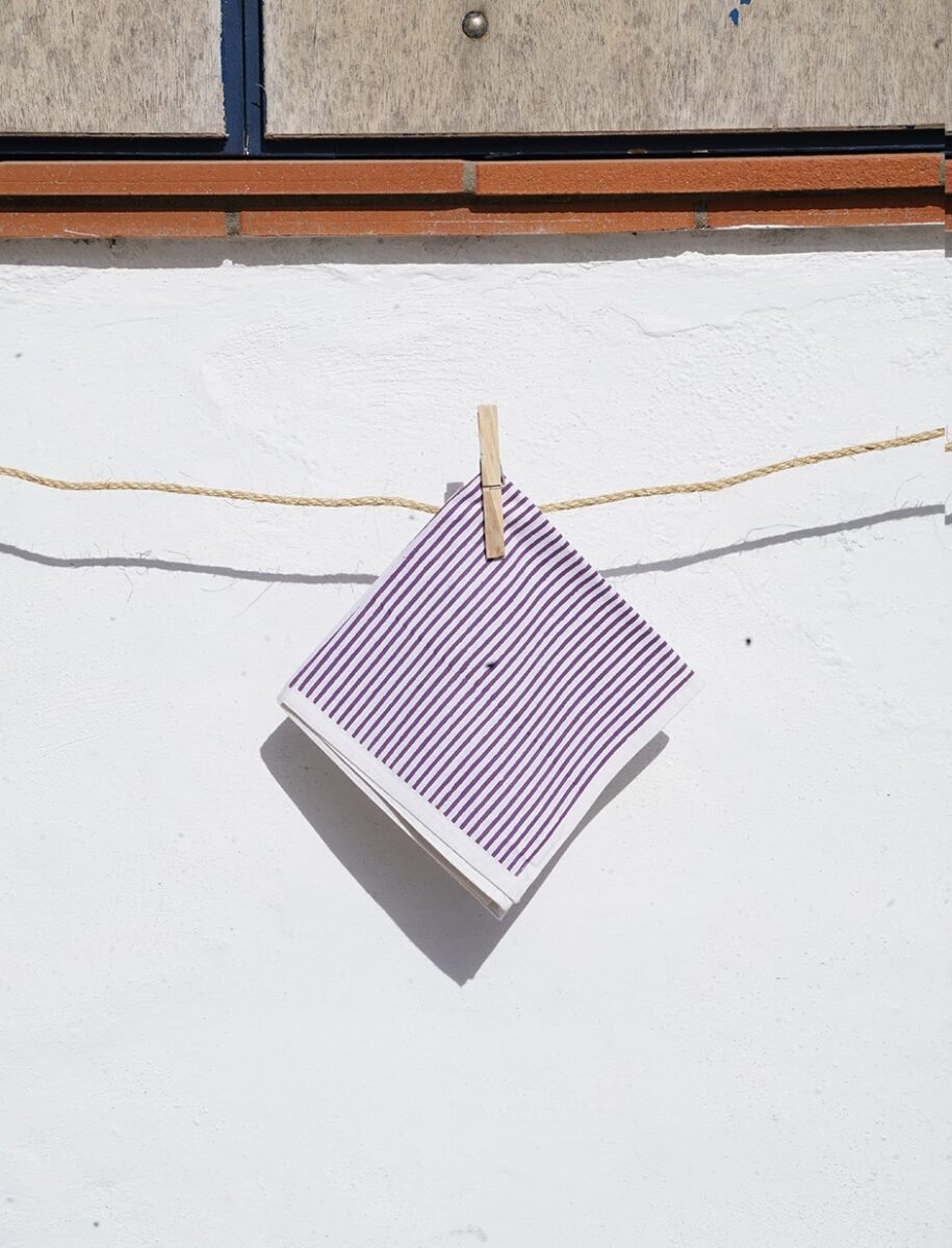 Ideal juego de 2 servilletas en algodón natural, con dibujo de rayas finas en color malva y fondo blanco. Nuestras servilletas son artesanales y proceden de la ancestral técnica del block print.