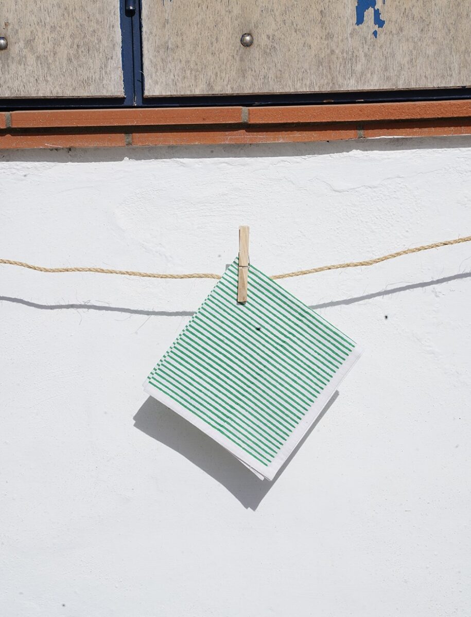 Ideal juego de 2 servilletas en algodón natural, con dibujo de rayas finas en color verde y fondo blanco. Nuestras servilletas son artesanales y proceden de la ancestral técnica del block print.