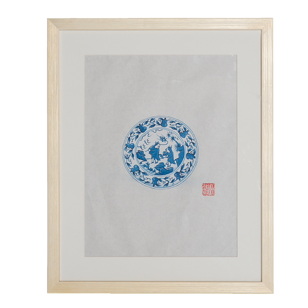 Decorativa acuarela en fino papel seda dibujo porcelana plato chino estampado azul enmarcada con passpartout. Reproducción de vintage prints.