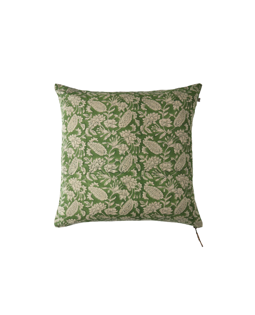 Este cojín de lino color Verde, ofrece una sensación de lujo gracias a su hermoso patrón estampado a mano y a su tejido de lino. Diseñado con atención a la calidad y a los detalles confeccionado con lino de primera calidad y presenta una cremallera resistente adornada con un delicado detalle de cuero.