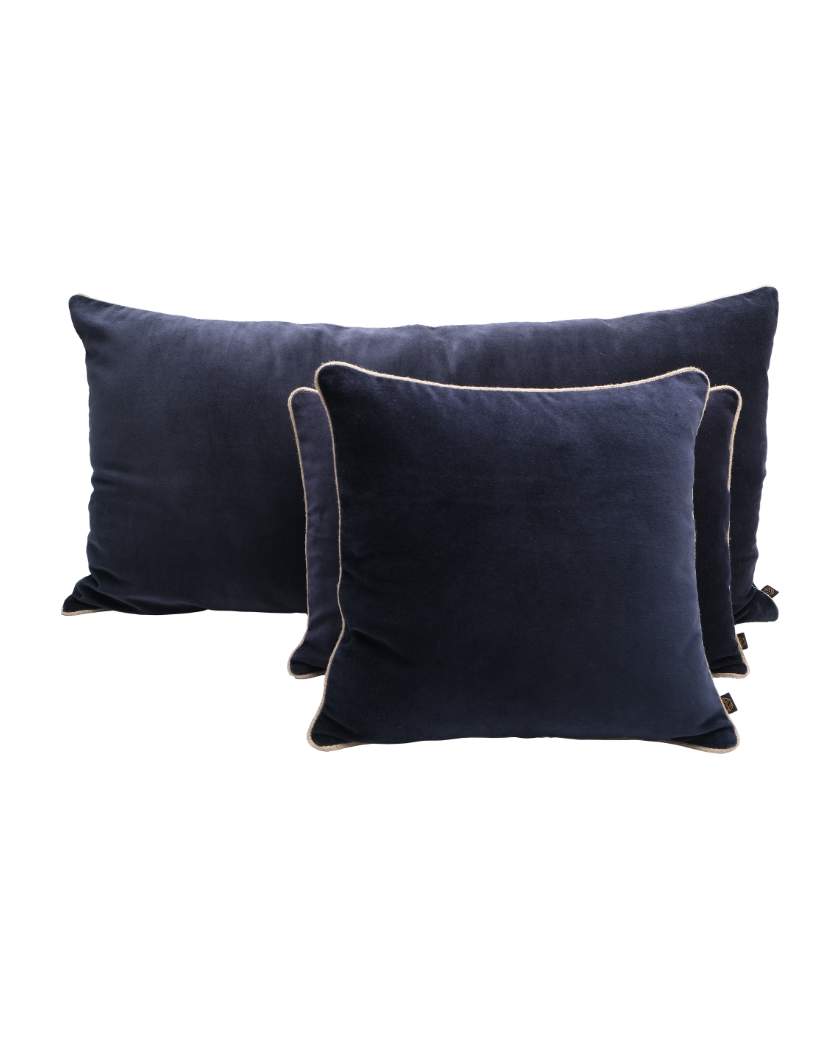 Maravilloso cojín color azul marino y acabado aterciopelado con ribeteado color Arena.