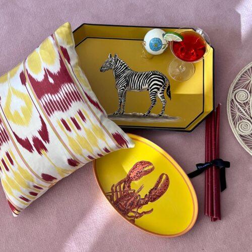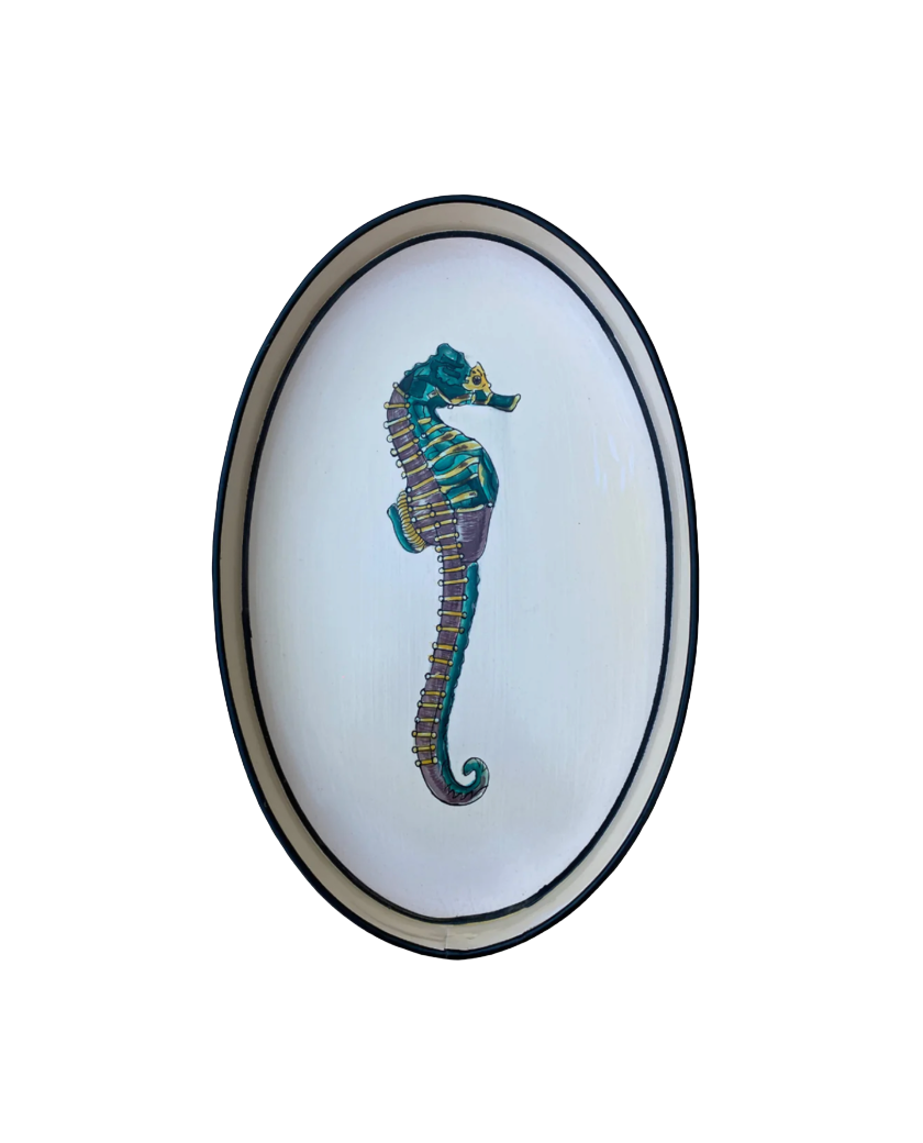 Preciosa bandeja de metal con forma ovalada con dibujo de caballito de mar, pintada completamente a mano, piezas que iluminarán cualquier espacio de tu hogar. Además esta bandeja podrá ser el Regalo Perfecto para cualquier ocasión.