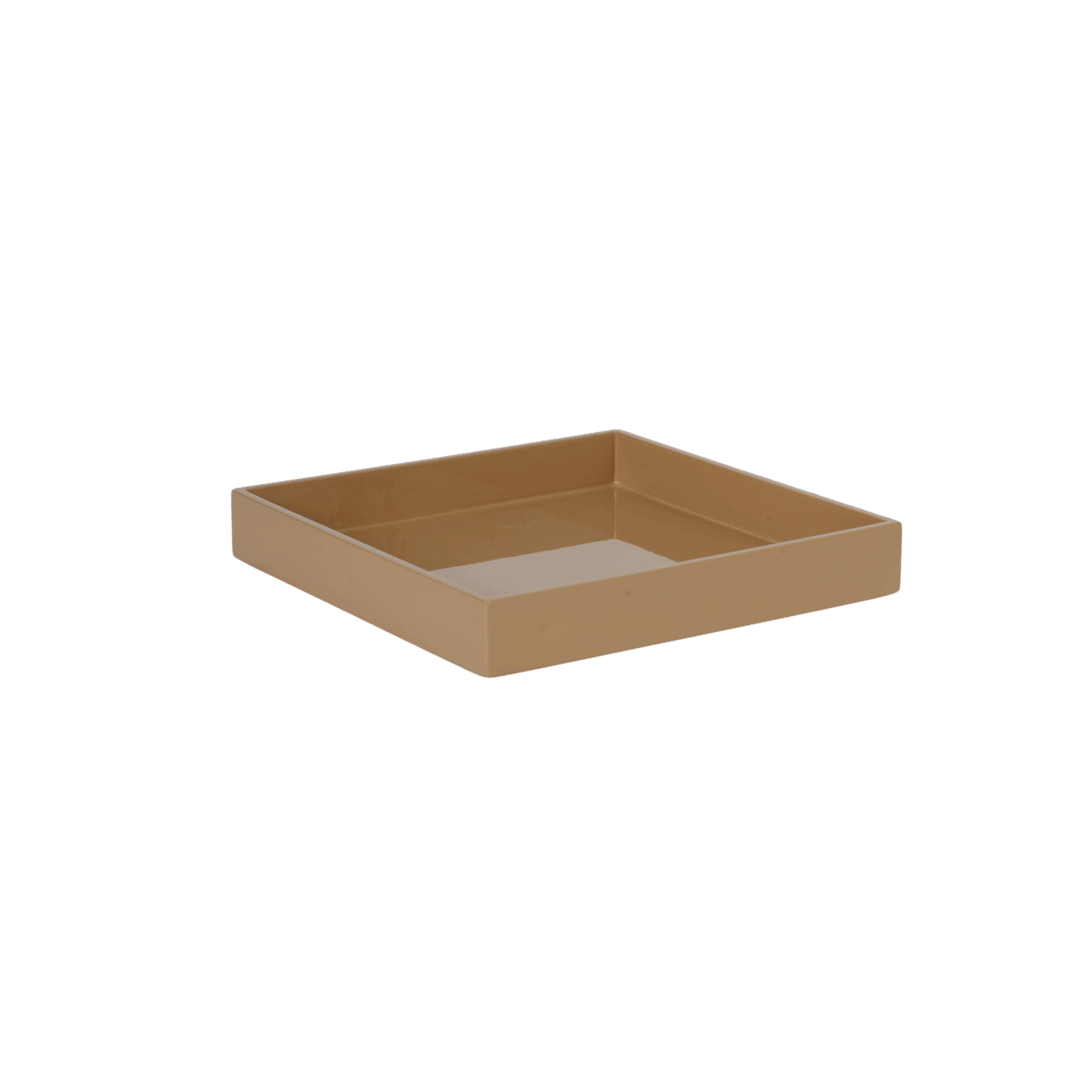 Exclusiva bandeja lacada en un bonito acabado de alto brillo en color Camel, tamaño 20X20cm.