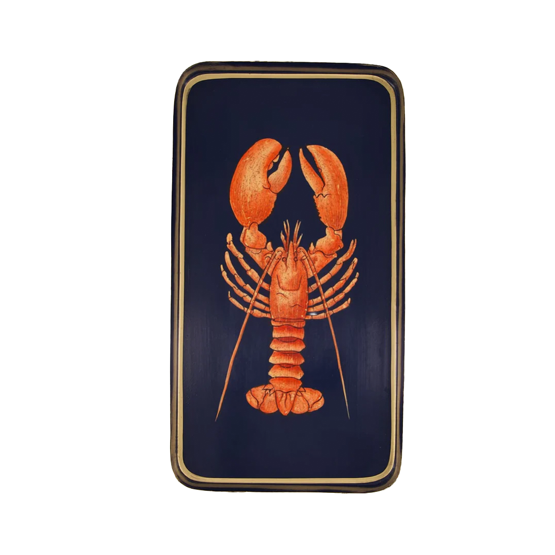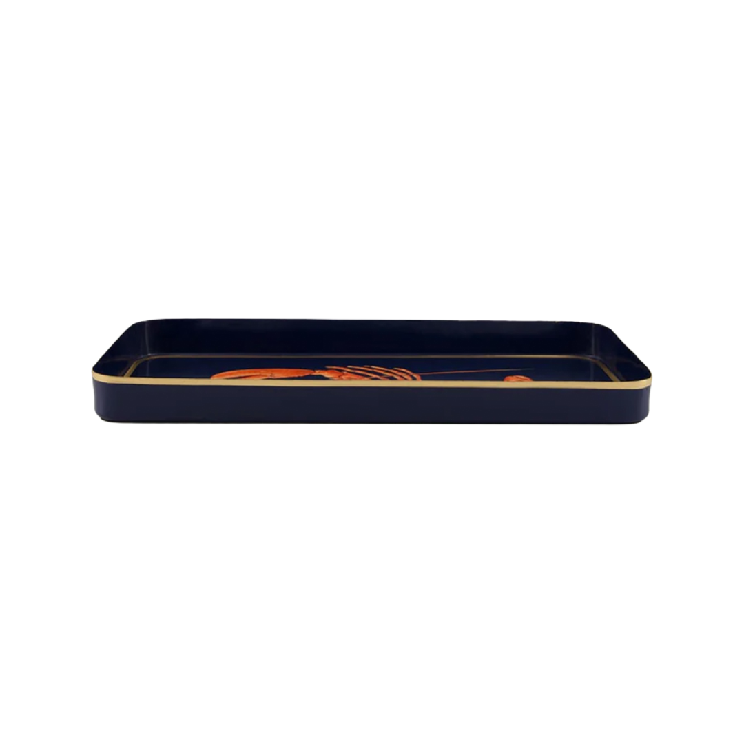 Bandeja preciosa de metal en color azul con dibujo de una langosta en color caldero, ribete dorado en contraste y forma rectangular rígida.