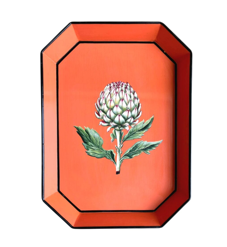 Espectacular y bonita bandeja de metal con dibujo de una bonita alcachofa pintada a mano sobre un fondo naranja, perfecta para iluminar cualquier rincón de tu hogar.