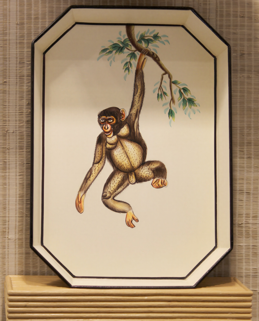 Elegante y divertida así son las bandejas de hierro pintadas a mano de la firma italiana Les Ottomans. Su diseño en tono arena destaca por su llamativa ilustración de un mono en una rama finamente pintado a mano.