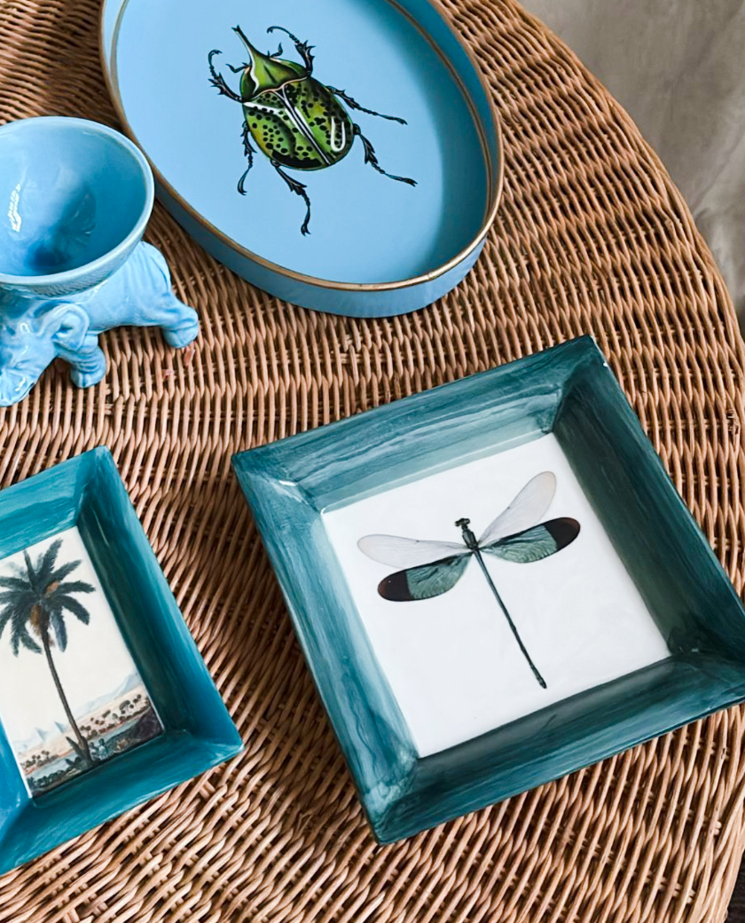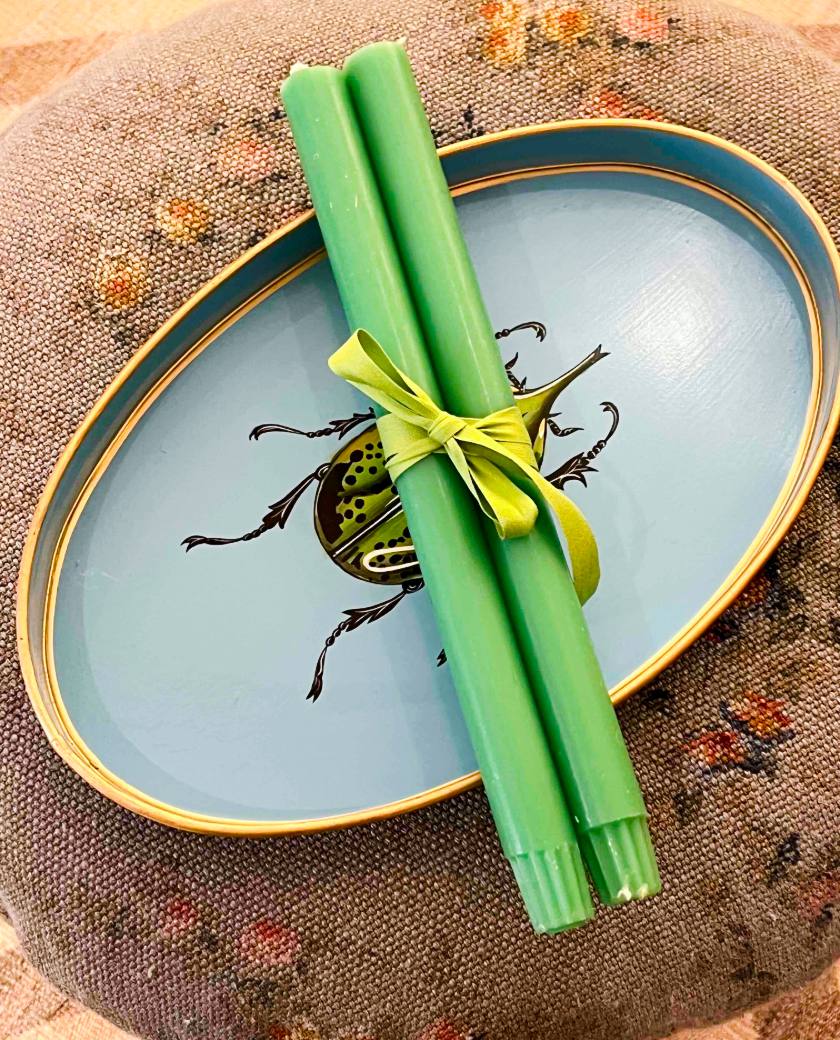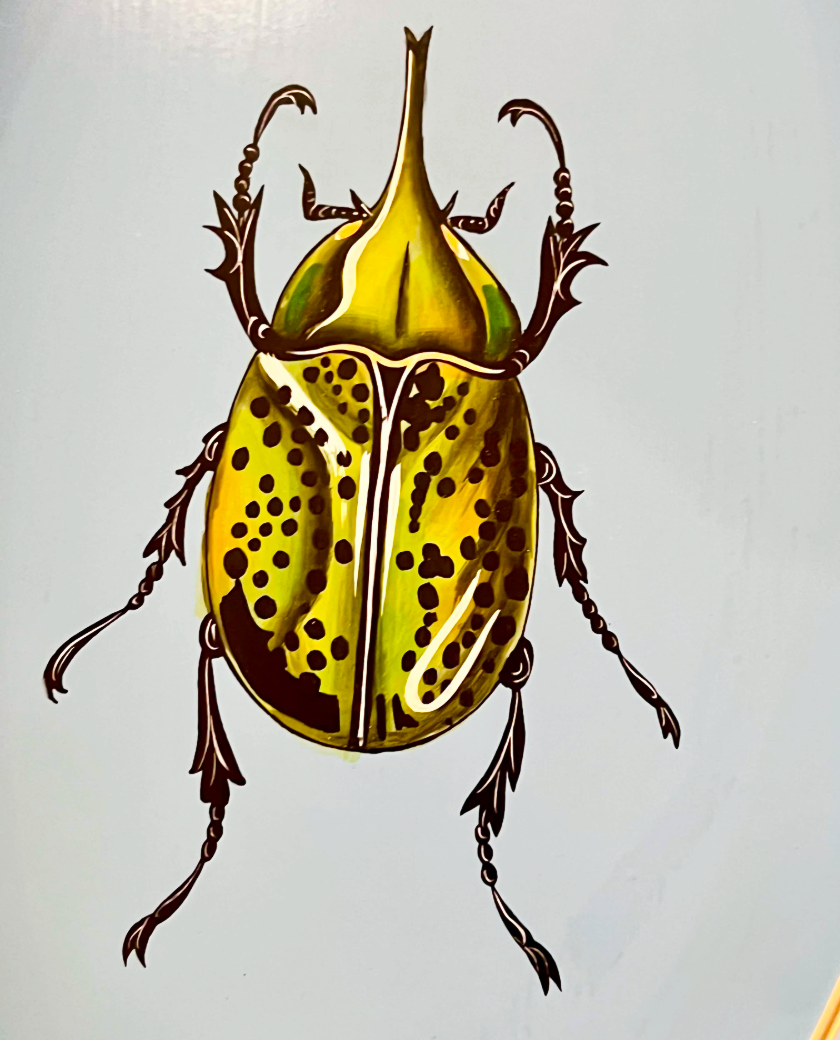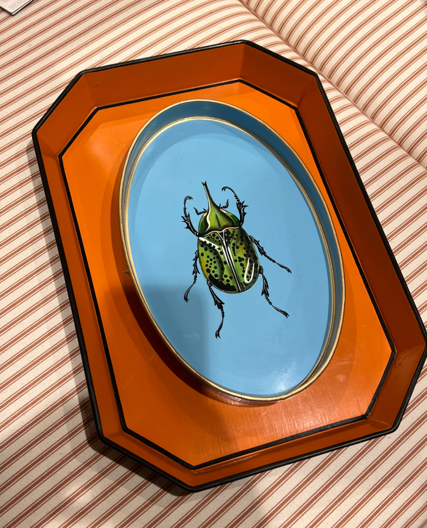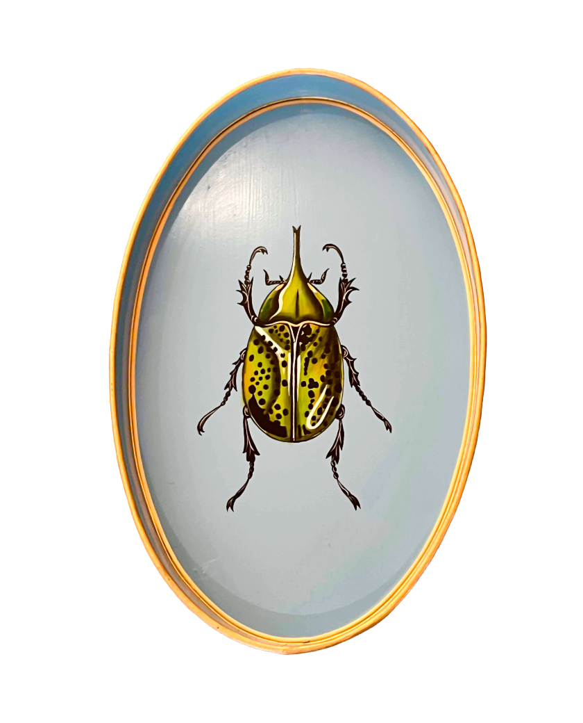 Preciosa bandeja de metal ovalada con dibujo de un bonito escarabajo verde, pintada completamente a mano, piezas que iluminarán cualquier espacio de tu hogar. Además esta bandeja podrá ser el Regalo Perfecto para cualquier ocasión.