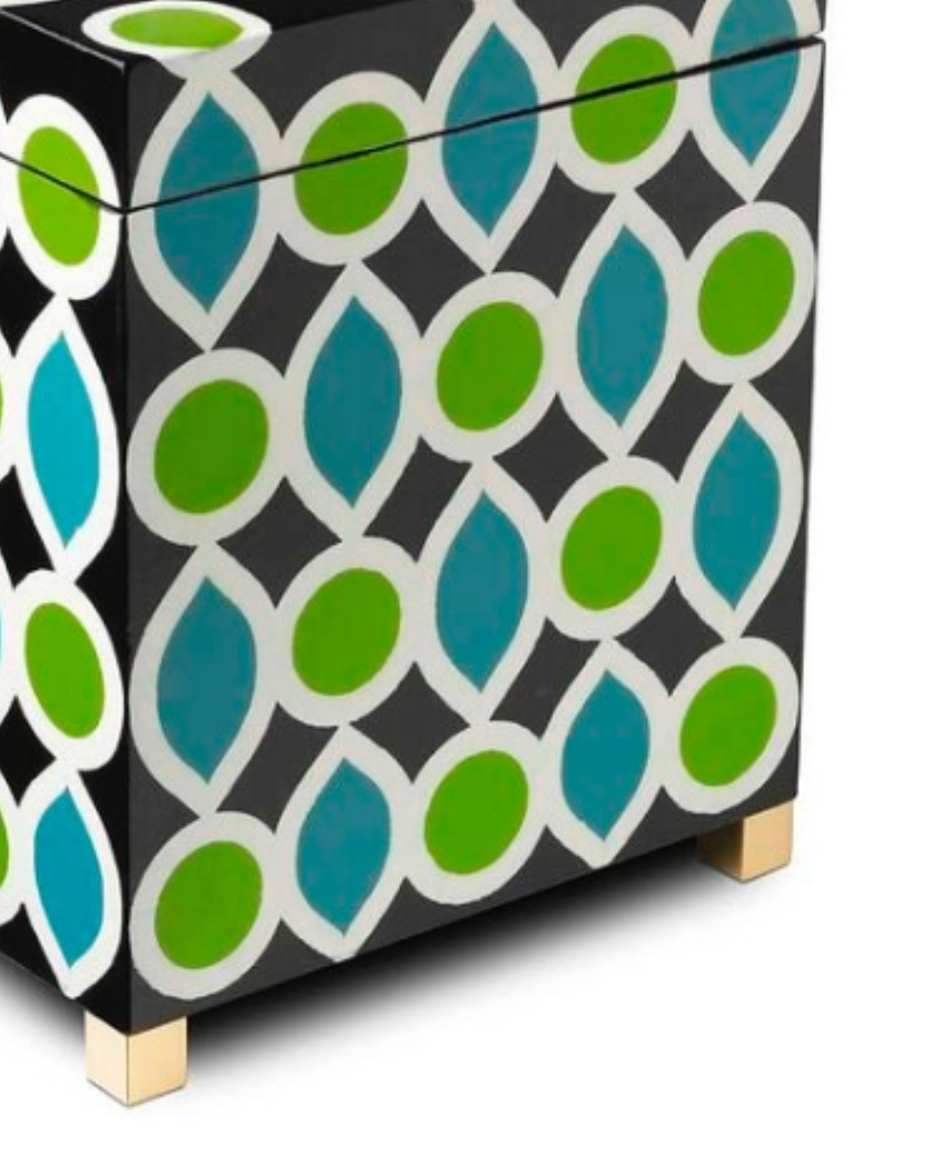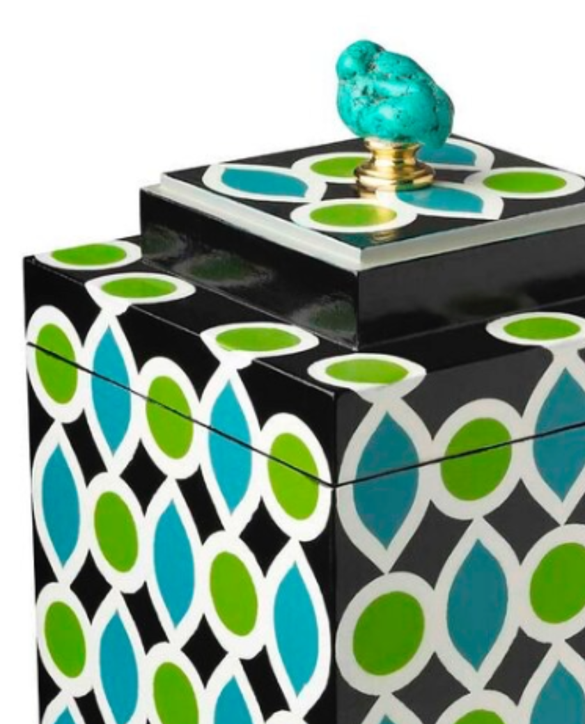 Lujosa y sofisticada caja de madera negra print estilo años 70 en tonos verde y turquesa. Decorada con una piedra turquesa, sus cuidadosos detalles en metal dorado hacen que sea una pieza decorativa para espacios muy cool.