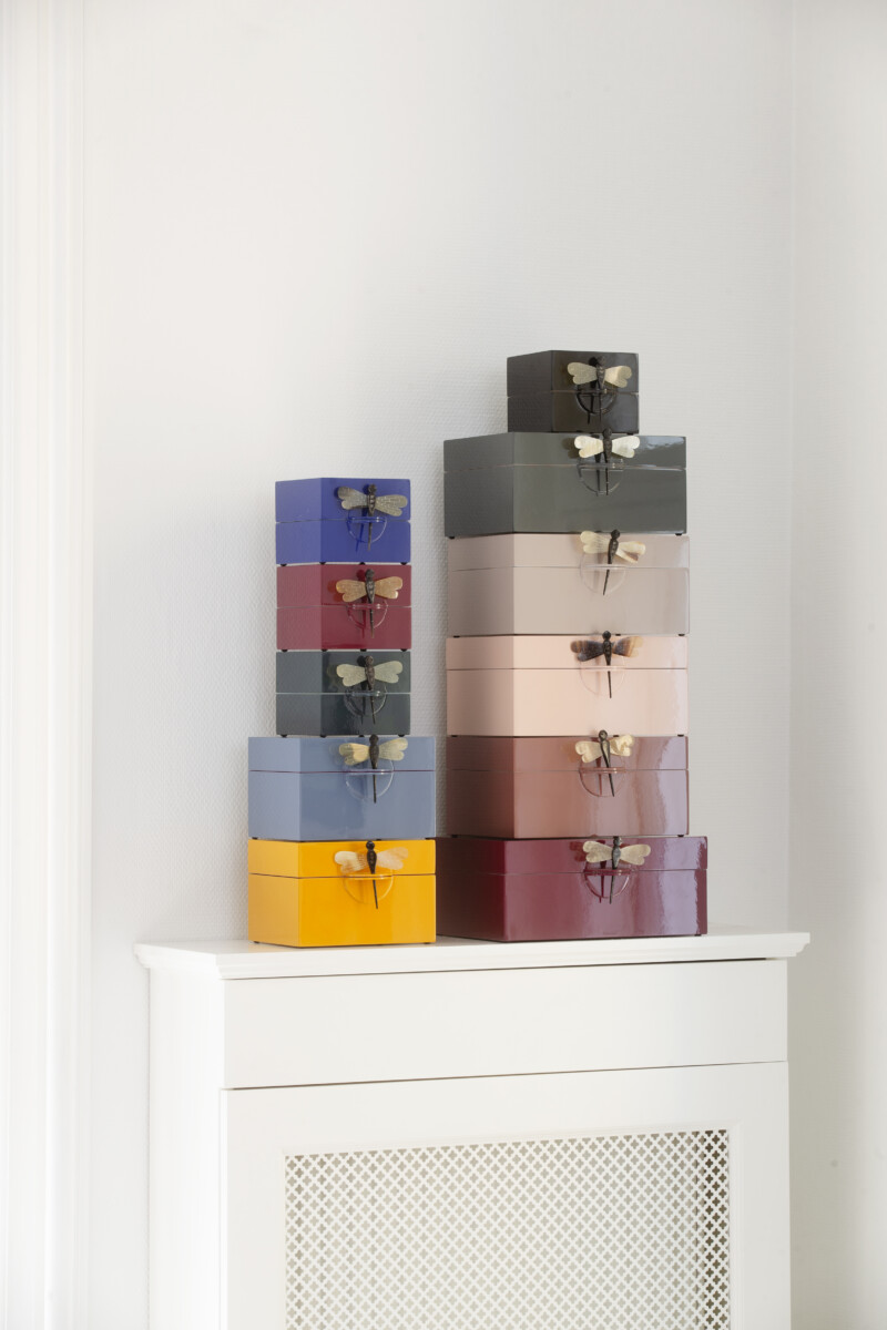 Berenjena por fuera, gris por dentro, interior con bandeja para pequeños detalles.
