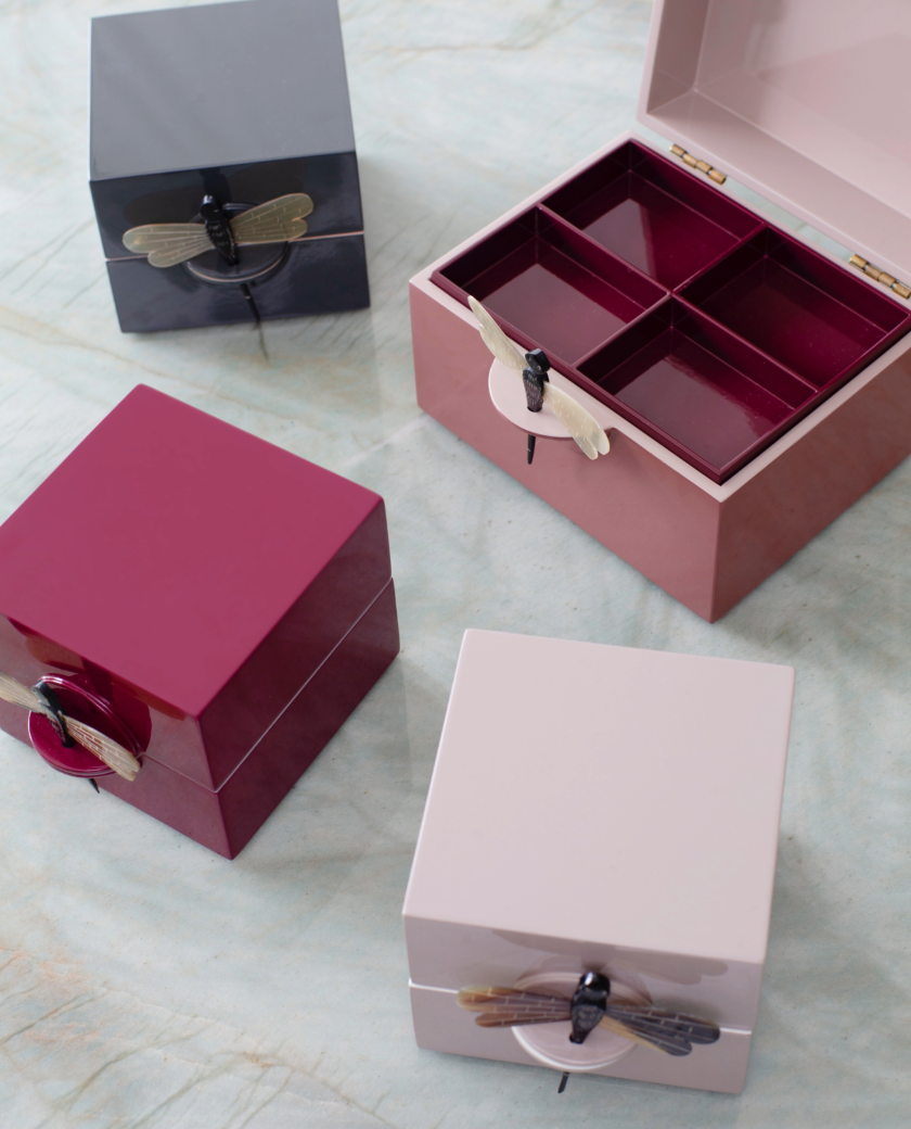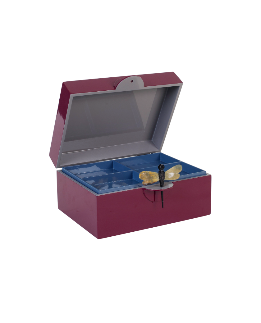 El detalle de libélula en cuerno de búfalo en el cierre añade un aire distintivo y refinado, convirtiéndola en una pieza decorativa además de práctica. Fabricada en madera MDF con 13-15 capas de laca.