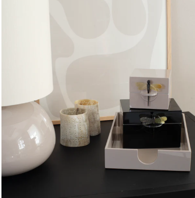 Elegante y funcional, esta caja de laca negra es el accesorio perfecto para mantener tus objetos personales organizados con estilo. Su acabado brillante le aporta un toque sofisticado, ideal para complementar cualquier espacio, desde el tocador hasta la sala de estar.