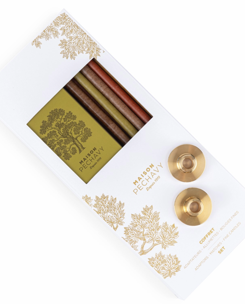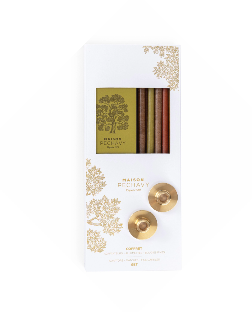 Caja Regalo Maison Pechavy compuesta por 2 adaptadores de latón, 10 velas finas y 40 cerillas largas.