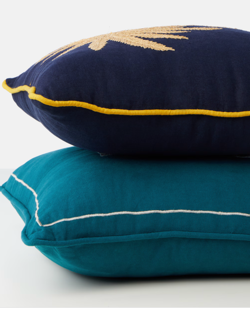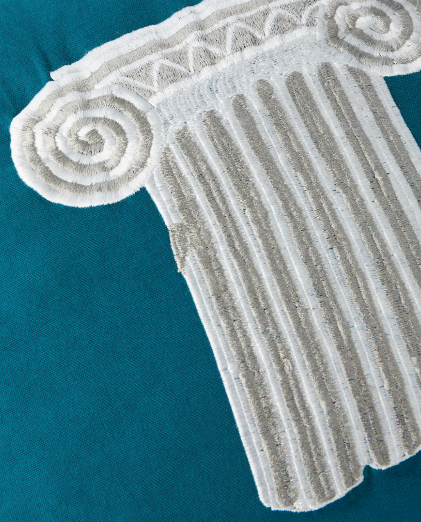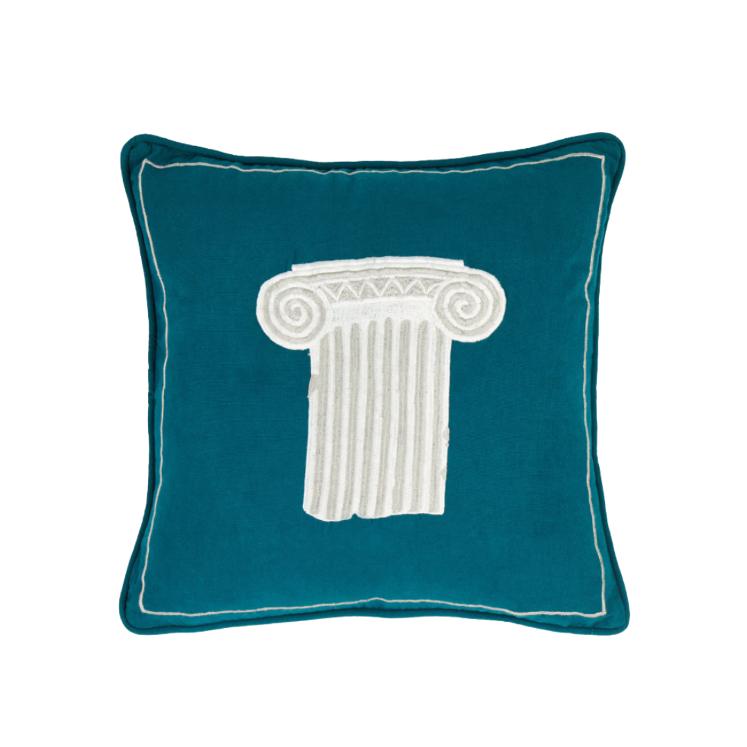 Divertido, cómodo y creativo, así es este bonito cojín de algodón bordado a mano con dibujo columna griega sobre un fondo azul y ribete al tono, su diseño complementará fácilmente la decoración moderna de su zona favorita y se combinará maravillosamente con una variedad de otros diseños. Cada cojín es único, tejido y hecho a mano.
