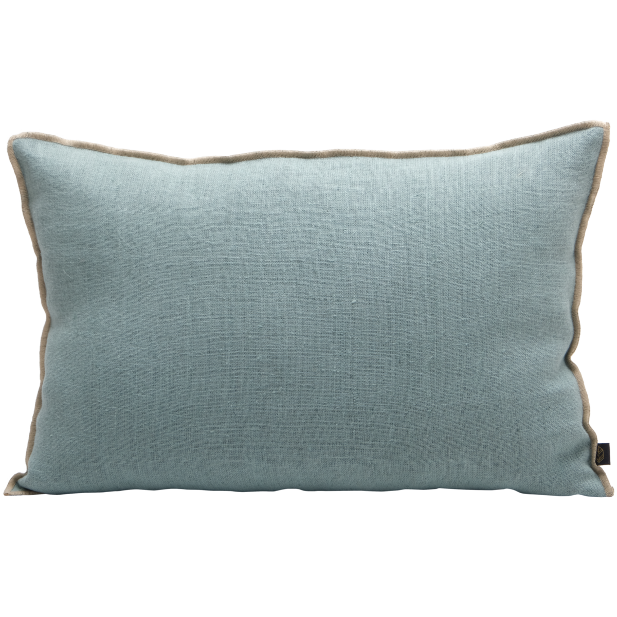 Maravilloso cojín de lino lavado en color celadón con ribeteado camel , cierre con cremallera y con unas medidas de 45×45.