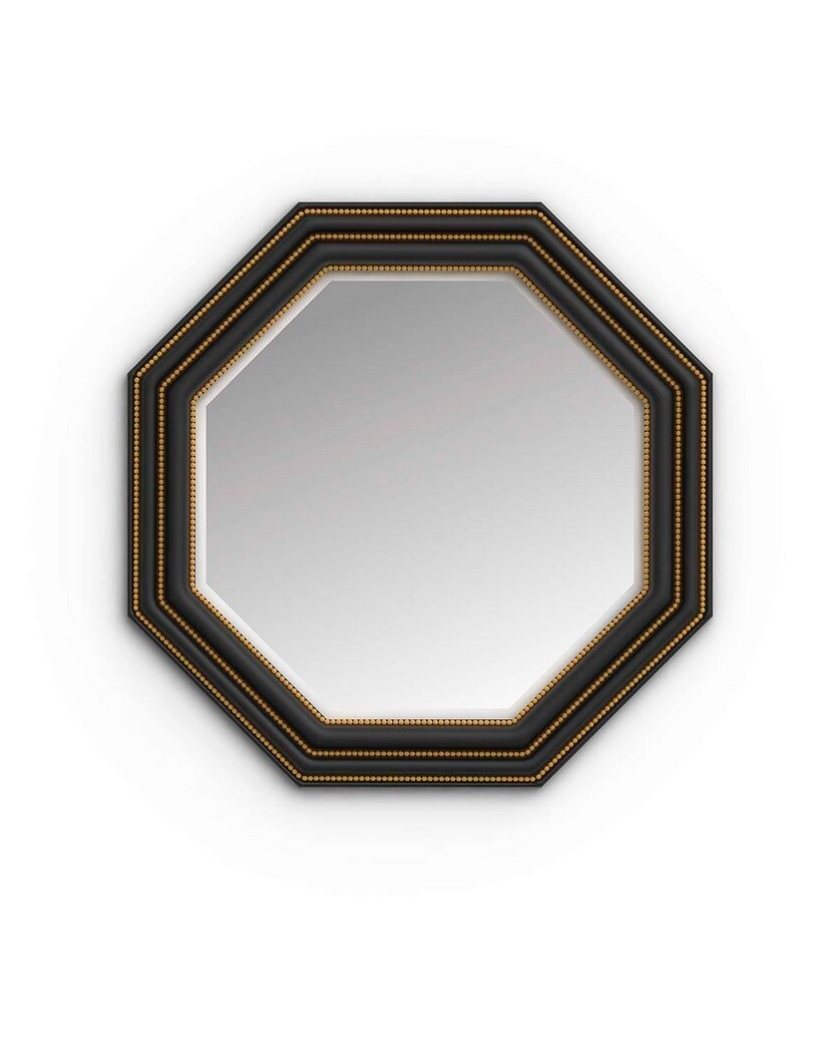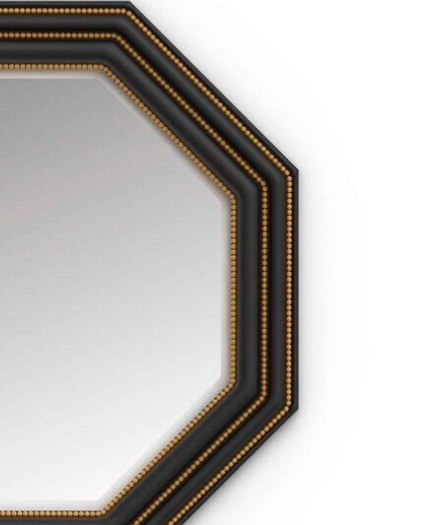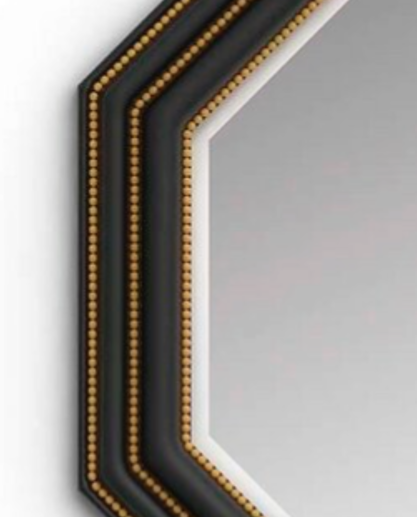 Elegante y espectacular espejo octogonal tallado a mano en madera negra.Con bonitos detalles en latón y espejo biselado.