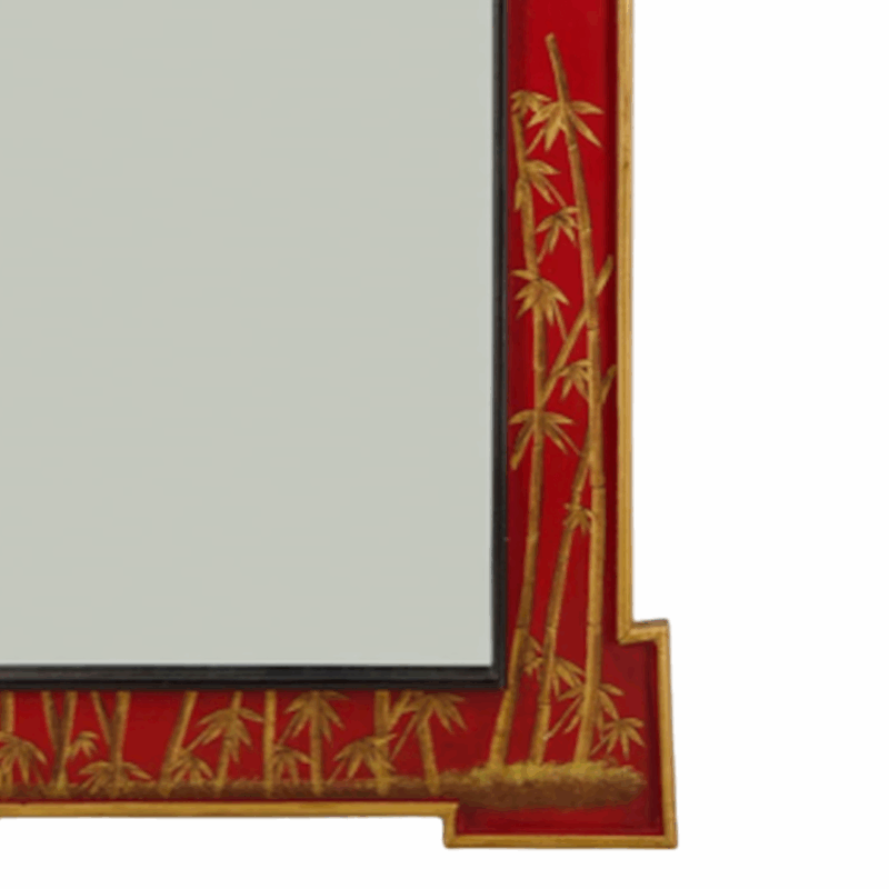 Este espejo es una pieza llamativa pintada a mano con un marco en color rojo intenso y elegantes motivos dorados de bambú y pájaros. Un diseño con fusión del encanto oriental y estilo contemporáneo, ideal para agregar un toque de color y un toque lujoso a cualquier interior moderno o tradicional.