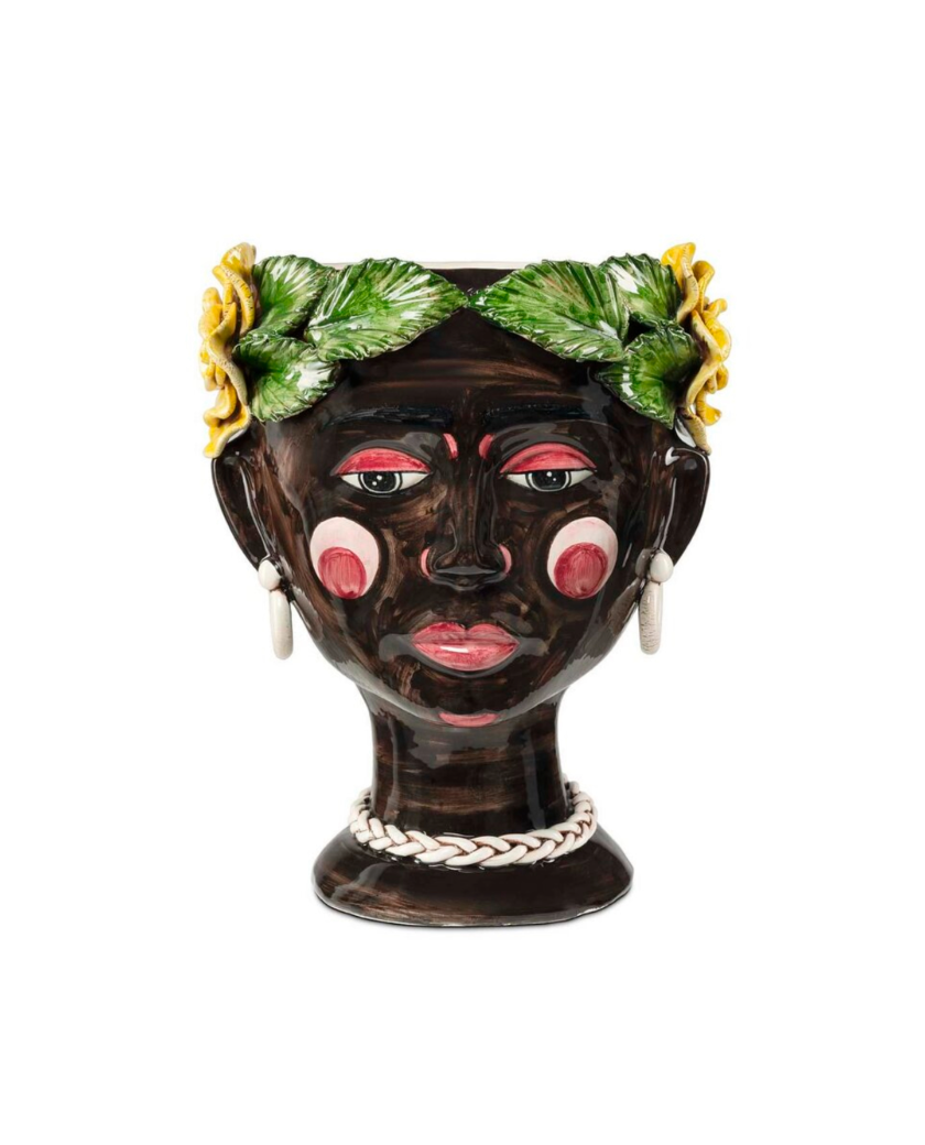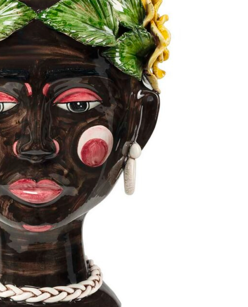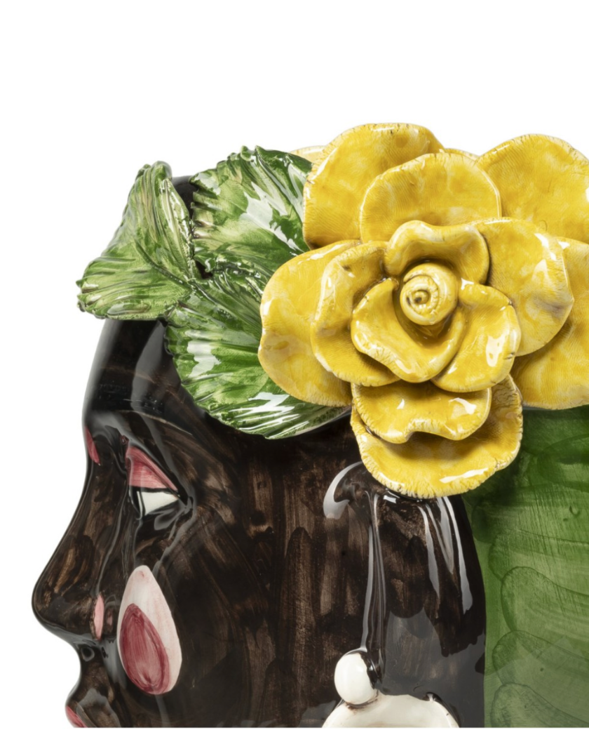Cabeza siciliana inspirada en las famosas Testa di Moro, un objeto característico de la tradición Italiana. Se trata de un jarrón de cerámica pintado a mano que se utiliza como adorno y que representa el rostro de una bella joven. Una interesante leyenda de amor se esconde detrás de este famoso objeto.