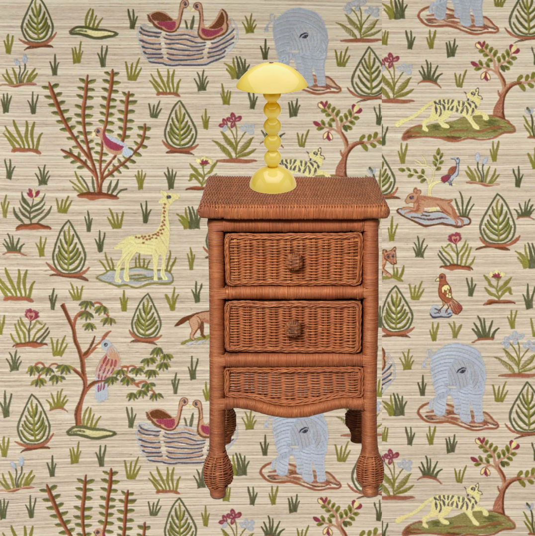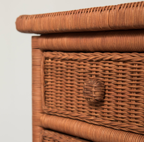 Mesita de noche de ratán en tono marrón tejida por artesanos expertos. Ideal para dormitorios de estilo boho, mediterráneo o nórdico. Aporta calidez, ligereza y un toque artesanal único.”