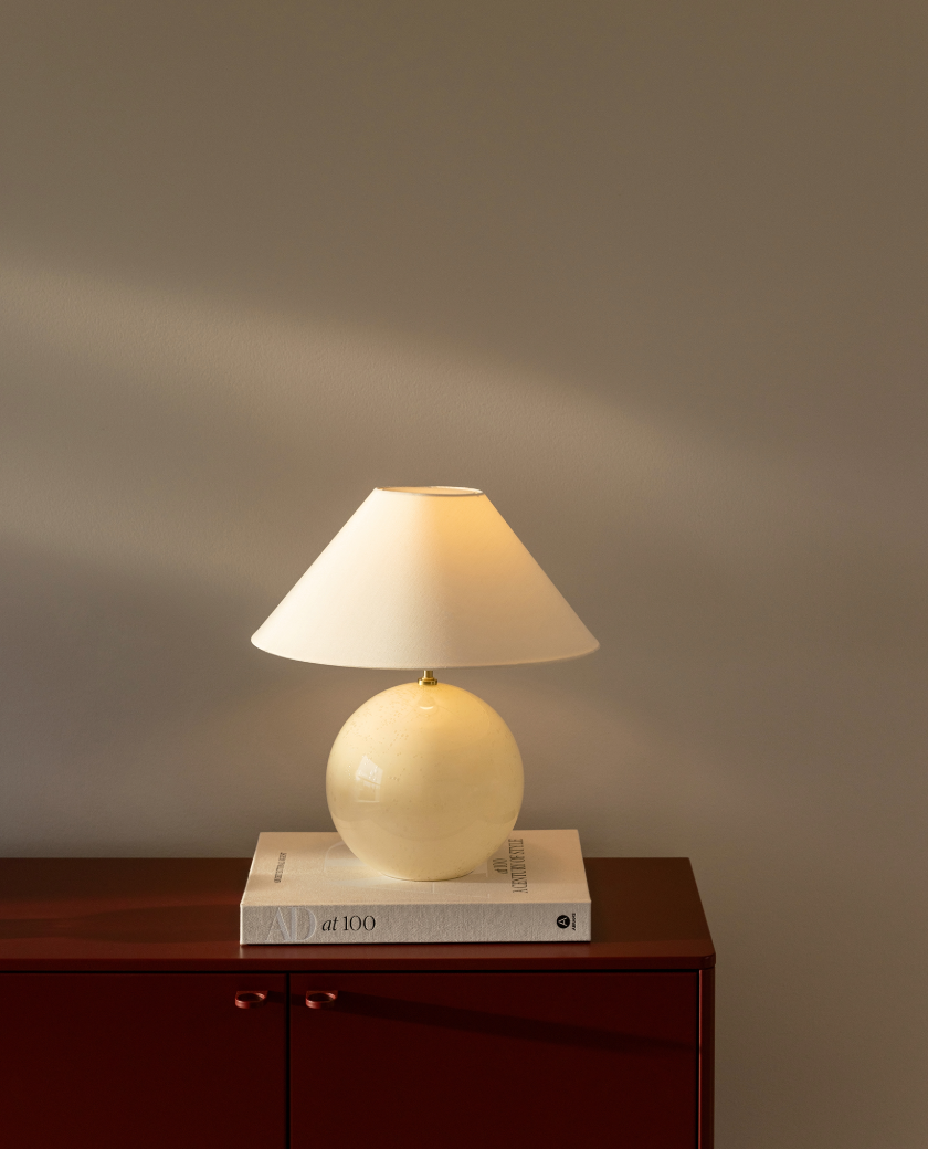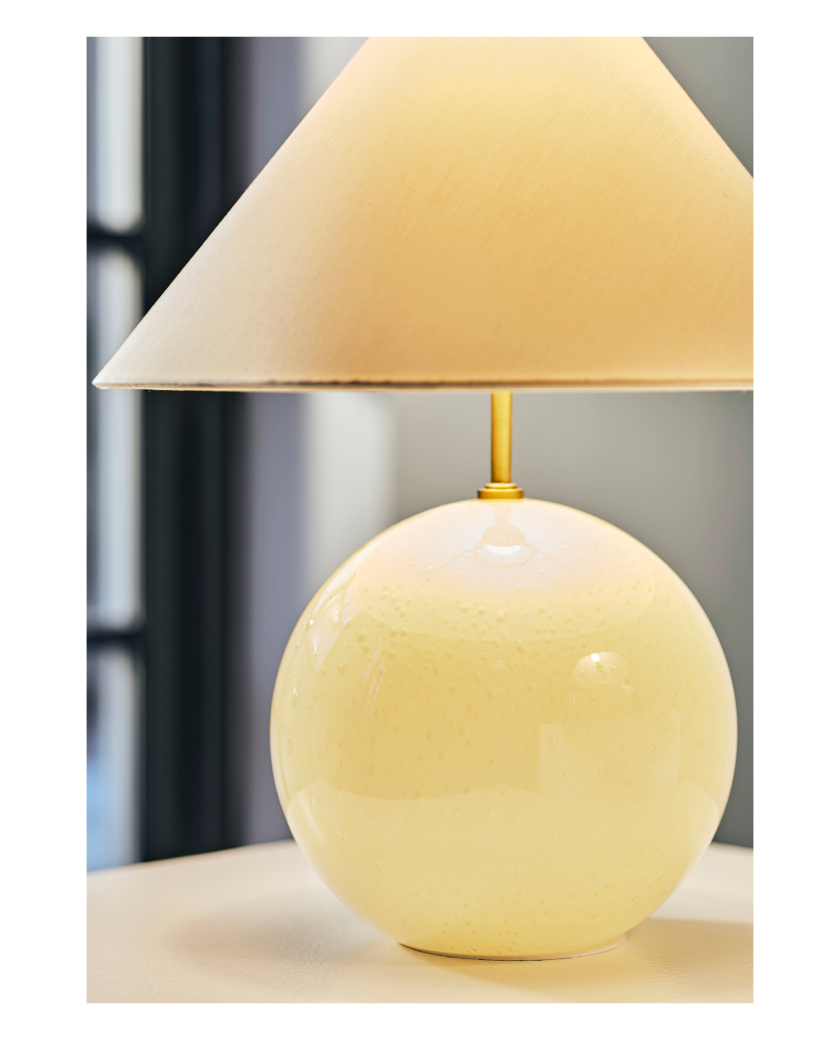Lámpara de mesa en vidrio tintado con burbujas de aire sopladas y cuenta con una pantalla de algodón a juego con una cubierta que combina con la base. Su tamaño es ideal para colocarla sobre una mesa auxiliar, una cómoda grande o en una ventana profunda.