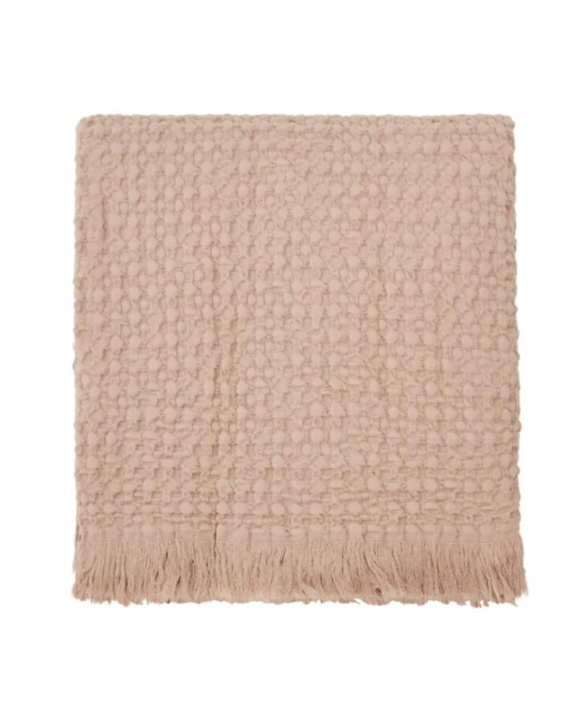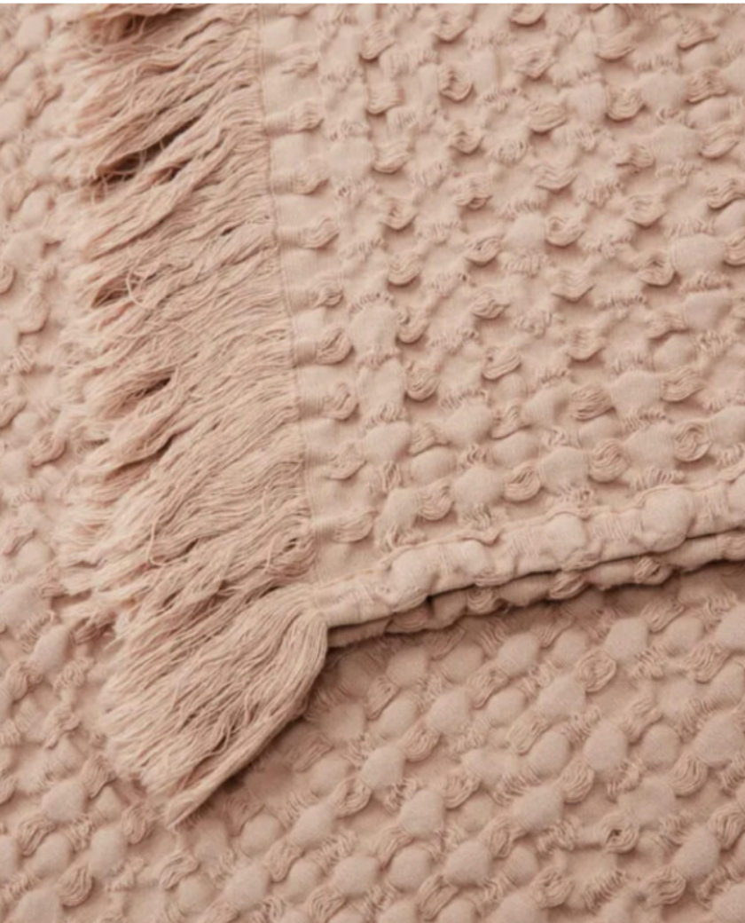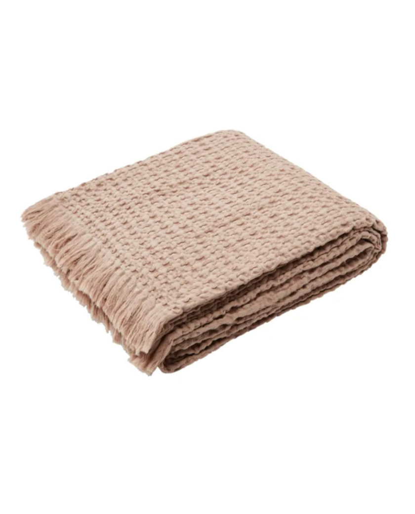Manta o colcha fina de algodón en color rosa empolvado y acabado en flecos, ideal para sofá o pie de cama.