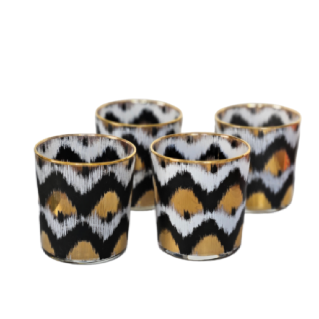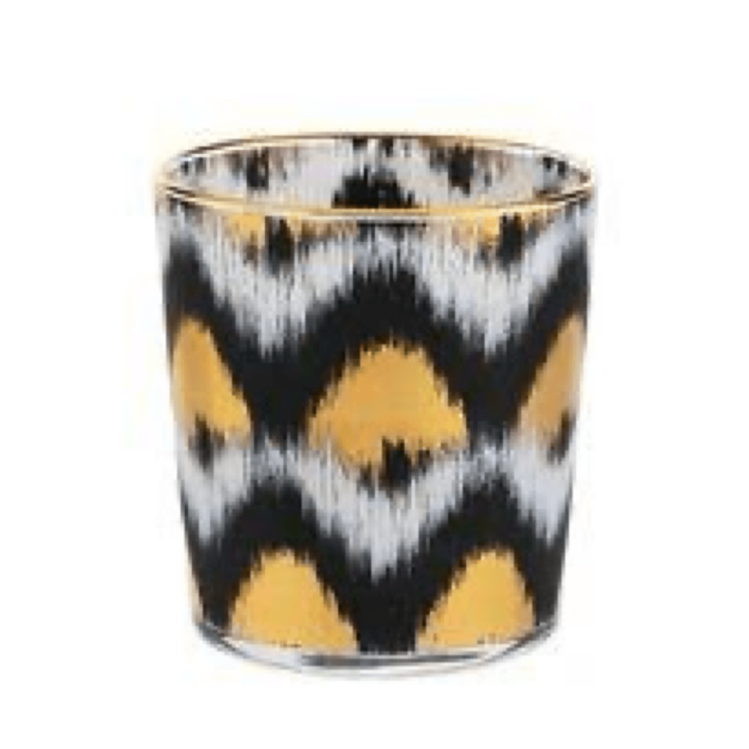 Set de 2 Espectaculares vasos multicolor con estampado Ikat en color Oro y Negro, vista su mesa con una de estas piezas exclusivas de nuestra nueva colección Otoño-Invierno y su mesa no pasará desapercibida , disponibles en más colores.