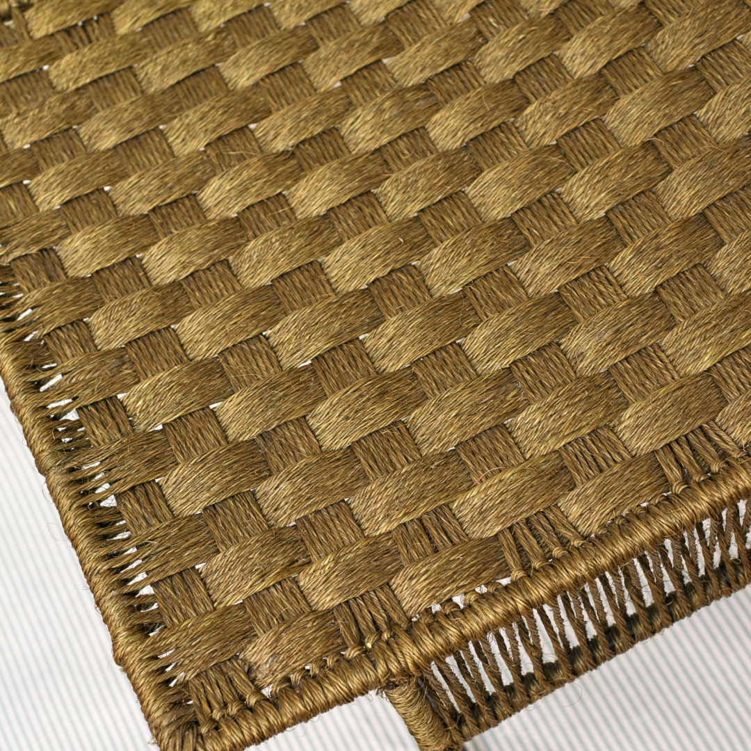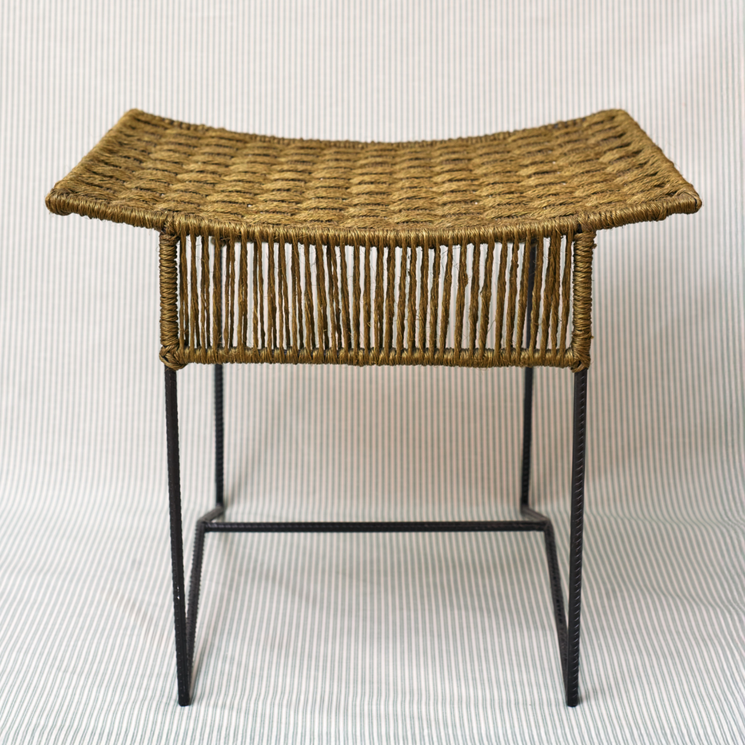 Ideal asiento estructura hierro y asiento diseño geométrico tejido a mano artesanalmente en Colombia con fibra de iraca, color verde.