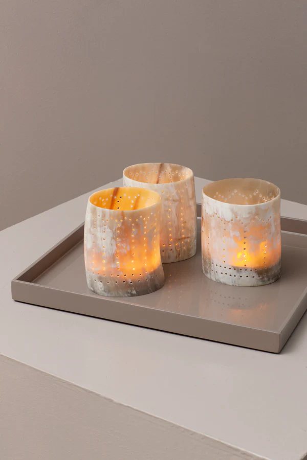 Vasos decorativos fabricados en cuerno de búfalo, ideal para decorar mesas auxiliares, bandejas o estanterías. Perfectos como portavelas, lapiceros o simplemente como piezas decorativas.